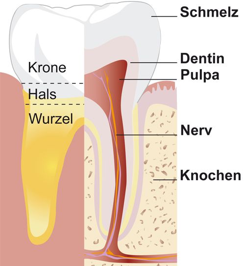 Beim Blick in den Mund sind nur die Zahnkronen zu sehen. Unter dem Zahnfleisch und im Kieferknochen verborgen, liegt der wesentlich längere und unsichtbare Teil des Zahns, der Zahnhals und die Wurzel. Bei gesunden Zähnen sind beide vollständig vom Zahnfleisch bedeckt. Die Zahnwurzel ist durch ihr Zahnfach, der Alveole, im Kieferknochen verankert. Die Hauptmasse des Zahn, das Zahnbein oder fachsprachlich Dentin, setzt sich im Gegensatz zum Zahnschmelz vor allem aus Kalzium und Phosphor zusammen. Weitere Bestandteile sind Magnesium und Fluorid.
